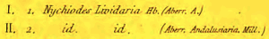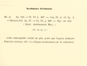 Müller et al. (2019: 357) geben als Originalbeschreibung an: “Nychiodes lividaria var. andalusaria Millière, 1865: Iconogr. Descr. Chenilles Lépid. inédits II: 77, pl. 60, fig. 2.” Millière selbst bezeichnet das Taxon jedoch zweimal als „Aberr.“ (unter der Überschrift und auf der Tafel 60); im Text schreibt er zweimal „variété“. Wenn ein Taxon als Aberration und nicht als Varietät beschrieben ist, gilt es im Sinne des ICZN als infrasubspezifisch. Wir folgen der Auffassung von Müller et al. (2019), auch weil Fazekas (1997: 23) einen Neotypus in diesem Sinne festgelegt hat.