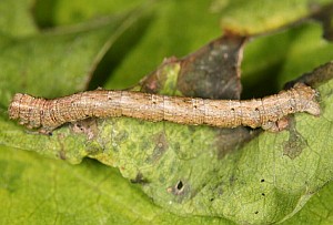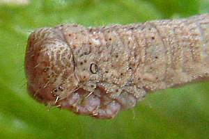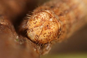 6: Jungraupe, Deutschland, Bayern, Unterallgäu, Woringer Wälder, ca. 630 m, auf Lonicera nigra, 25. Oktober 2013 (leg., cult. & Studiofoto: Peter Schmidt), det. Heidrun Melzer, conf. durch ZuchtergebnisForum