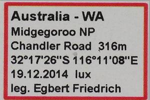 1: Australien, ACT, Canberra, Universitätscampus, 580 m, 12. Dezember 2014, am Licht (det. & fot.: Wolfgang Hackbusch), conf. Egbert Friedrich und Dominik HoferForum