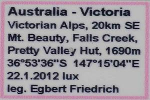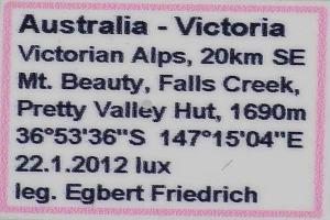 McQuillan (1985: 192): “Holotype ♂, labelled “Mt. Ginini A.C.T. 5200 ft., 9 January 1957, I.F.B. Common” Registration number 3316 (ANIC).” — Paratypes: 6 ♂♂ and 9 ♀♀, all from Australia.