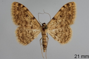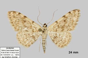 (Fig. 234-237.) ♂-Fühler bewimpert, ♂-Hintertibie mit einem Sporn, beim ♀ mit 2 Sporen. Sehr nahe bei semitata Prt. (Fig. 232, 233). Etwas heller, fahler gefärbt, die Costalflecke sind nie rußig schwarz wie bei semitata Prt., sondern immer braunschwarz und aus ganz feinen gewellten Linien bestehend, wie eingraviert. Postmediane nach außen nie spitz zulaufend, immer abgeplattet. Gesicht heller braun, etwas mehr graulich. Eine ohne Zweifel von semitata Prt. ganz verschiedene, doch anscheinend mehr lokale Art. Fort Mian-Kotal, Mai.“