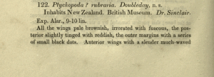- Original description: White, A. & E. Doubleday (1843): List of the Annulose Animals hitherto recorded as found in New Zealand, with Descriptions of some New Species. — In: Dieffenbach, E. (1843) Travels in New Zealand; with contributions to the geography, geology, botany, and natural history of that country. Vol. II: 265-295. London (John Murray).