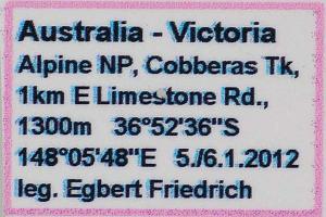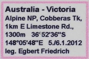 1: ♂, Australia, Victoria, Victorian Alps, Alpine NP, 50km NE Omeo, Cobberas Tk, 1km E Limestone Road, 1300 m, 6. January 2012; (det. & phot.: Egbert Friedrich)