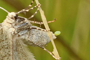 Es ist das typische Verhalten eines "Ei-Streuers": Die Weibchen fliegen langsam über die Vegetation, lassen sich in derselben nieder, verharren einige Sekunden (ohne Hinterleibskrümmung) fliegen weiter, lassen sich wieder nieder, usw.. Ein solches Verhalten kann sich - selbstredend - nur eine polyphage Art erlauben. Bemerkung: Stefan Hafner.