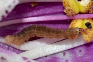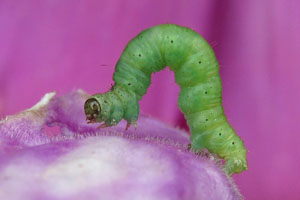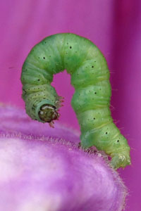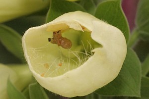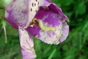 3: Gegen Ende der Blütezeit des Fingerhuts konzentrieren sich die Raupen oben im Blütenstand. Von diesen fünf Blüten sind drei befallen. [Forum]