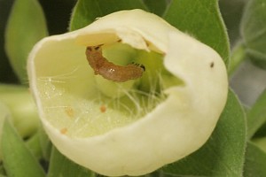 2: Die Raupe spinnt ihre Nahrungsblüten zu, woran befallene Blüten (Bildmitte) zwischen den geöffneten sofort erkennbar sind. [Forum]