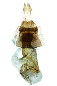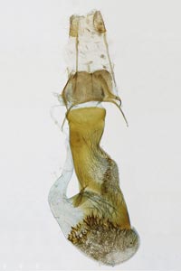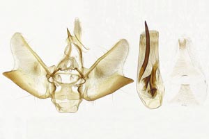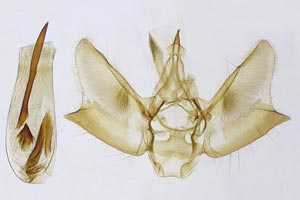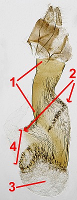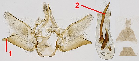 - ein Cornutus des Aedeagus besonders lang, normalerweise aus dem Aedeagus-Rohr herausragend (2)
