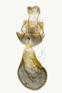 - ein mittelgroßer plattenförmiger Cornutus, der gegen die Basis unsymmetrisch, oft mehr oder weniger gabelschwanzförmig ausläuft (3)