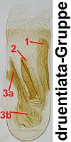 - ein nach oben in zwei lange Spitzen (3a) auslaufender Cornutus, die Verbindung an der Basis mehr oder weniger verdickt (3b) (die beiden Spitzen sind bei diesem Präparat überlagert und daher nicht gut erkennbar. Besser erkennbar beim Präparat einer anderen Art aus dieser Gruppe, nämlich E. exiguata)