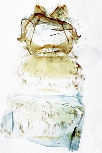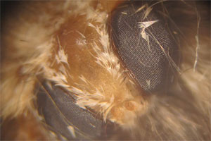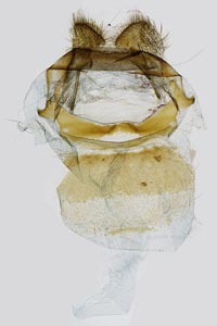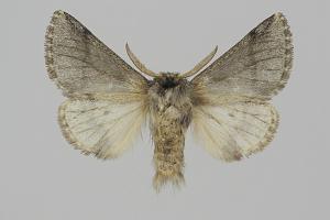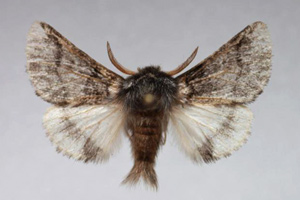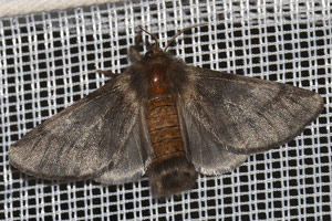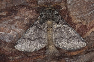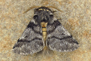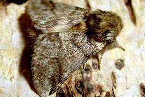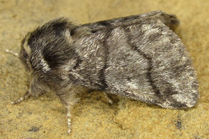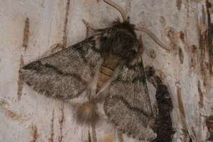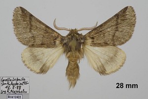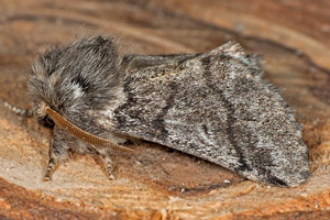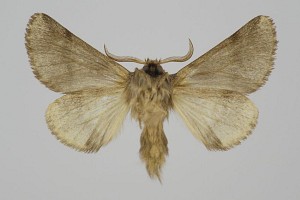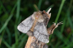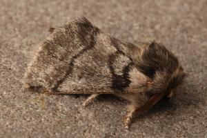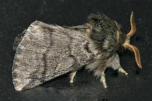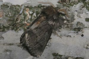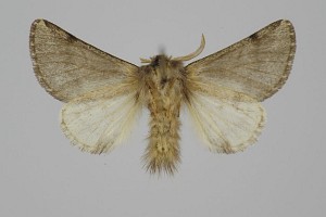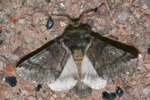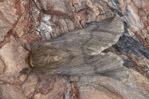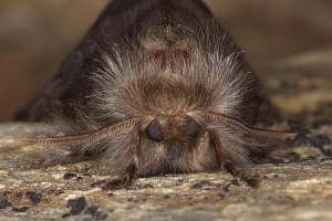 Falterstirn mit unauffälligem Vorsprung, Thaumetopoea pinivora und Thaumetopoea pityocampa haben eine sehr auffällig gezähnte Stirnleiste [Thomas Fähnrich im Forum]