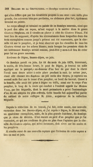 - Erstbeschreibung: Bellier de la Chavignerie (1880): Description d'un Bombyx nouveau de France. — Annales de la Société entomologique de France, 5e série 10: 367-368, pl. 11. Paris.