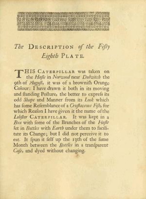 • Bezug einer Indikation in der Erstbeschreibung: Albin, E. (1720): A Natural History of English Insects. Illustrated with A Hundred Copper Plates, Curiously Engraven from the Life: And (for those who desire it) Exactly Coloured by the Author: [I]-[XIII], not paginated text page for each plate, pl. I-C. London.