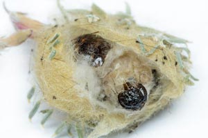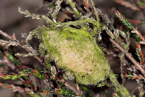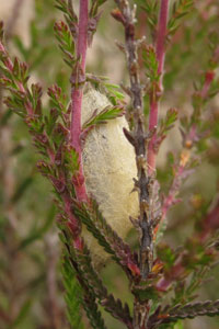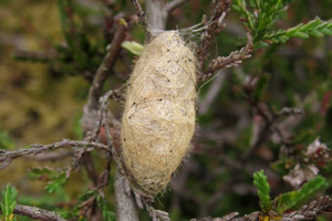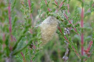 2-3: Kokons, Deutschland, Niedersachsen, Region Hannover, Gemeinde Wedemark, 40 m, Heidefläche, teilweise mit feuchten Stellen, umgeben von Kiefernwald auf Sandboden, auf Calluna vulgaris, 16. Juni 2016 (Freilandfotos: Tina Schulz), det. Thomas Fähnrich und Tina SchulzForum