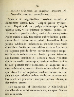 "Hæc Euprepia, ab illustrissimo D. Ménétriés ad describendum mihi communicata, campos Songariæ inhabitat." Der Falter wurde dem Autor also zur Beschreibung überlassen, wobei mit "D. Ménétriés" eigentlich nur der französische Zoologe Édouard Ménétries gemeint sein kann, der 1829-1830 unter militärischem Schutz eine große Kaukasus-Expedition durchführte und viele Insekten und Reptilien sammelte.