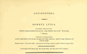 - Original description: Donovan, E. (1805): An Epitome of the Natural History of the Insects of New Holland, New Zealand, New Guinea, Otaheite, and other Islands in the Indian, Southern, and Pacific Oceans: Including the Figures and Descriptions of One Hundred and Fifty-Three Species of the more Splendid, Beautiful, and Interesting Insects, Hitherto Discovered in those Countries, and which for the most Part have not Appeared in the Works of any Preceding Author. The Figures are Correctly Delineated from Specimens of the Insects; and with the Descriptions are Arranged According to the Linnæan System, with Reference to the Writings of Fabricius and other Entomologists: I-IV; pl. [1]-[41]; unpaginated text pages. London.