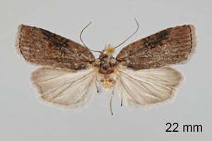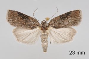 Palpen grau. Flügelzeichnung wenig variabel. Grundfarbe der Vorderflügel rein hellgrau und fast nie so dunkel wie bei Nycteola revayana. Mittelfeld in der vorderen Hälfte rotbraun bis dunkelbraun. Innere Querlinie doppelt und deutlich, übrige Zeichnungselemente undeutlich (dunkler Mittelpunkt meist vorhanden, ebenso Wellenlinie in Form undeutlicher Punkte). Flügel etwas kürzer und Apex weniger spitz als bei Nycteola revayana. Sichere Bestimmung abgeflogener Falter oft nur durch Genitaluntersuchung möglich. (Text: Axel Steiner)