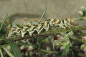 8-9: halberwachsen, Deutschland, Niedersachsen, Umgebung Bad Nenndorf, Moorbodenabbau- und -aufbereitungsanlage (= Brache mit unterschiedlichen Sukzessionsstadien auf Teilflächen), 70 m, Raupe an Artemisia vulgaris, 25. August 2014 (det. durch Weiterzucht & Freilandfotos: Tina Schulz)