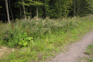 3: Larvalhabitat, Raupen an überhängendem Beifuß (Artemisia vulgaris): Deutschland, Niedersachsen, Umgebung Beckedorf, 150 m, lichter Waldweg im Mischwald, 25. August 2014 (Foto: Tina Schulz)Forum