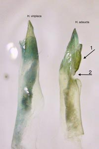 Ein wichtiges Unterscheidungsmerkmal bei den männlichen Genitalien ist der Aufbau und die Form des Aedeagus. Die Pfeile im Bild weisen auf die Unterschiede zwischen H. adaucta und H. viriplaca hin: