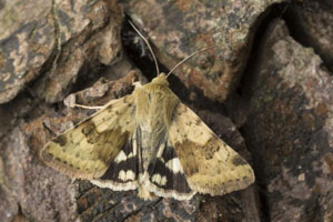 1: Heliothis viriplaca unterscheidet sich von Heliothis maritima [gemeint ist hier und im weiteren Text jeweils das Artenpaar Heliothis maritima / Heliothis adaucta (Anmerkung Erwin Rennwald)] vor allem durch den völlig anderen Verlauf der Zeichnung auf den Vorderflügeln. Die Mittelbinde z.B. läuft fast gerade auf den Hinterrand zu (b) während sie bei Heliothis maritima sehr schräg in Richtung Flügelbasis verläuft (a). Die äußere Begrenzung des Mittelfeldes bei den Vorder- und Hinterflügelunterseiten ist bei Heliothis maritima schwärzer und kontrastreicher als bei Heliothis viriplaca.