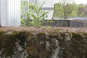 1-2: mit Algen und Moos bewachsene Betonmauer an einer Autobahn-Meisterei, Deutschland, Baden-Württemberg, Oberrheinebene, Grißheim, ca. 180 m, 25. April 2012 (Fotos: Helmut Kaiser)Forum