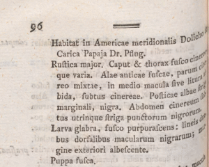 Fabricius (1794: 96) schreibt in seiner Erstbeschreibung: "Habitat in Americae meridionalis Dolicho et Carica Papaja Dr. Pflug."