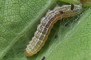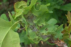 1: Raupengespinst in Gemeinschaft mit den beiden Zünslerarten Phycita roborella und Acrobasis consociella: Deutschland, Sachsen, Noitzscher Heide, Lindenhayn bei Bad Düben, Kiefern-Eichen-Mischwald, 13. Mai 2007 (Freilandfoto: Heidrun Melzer), cult. & det. Heidrun Melzer