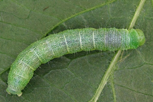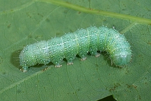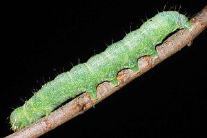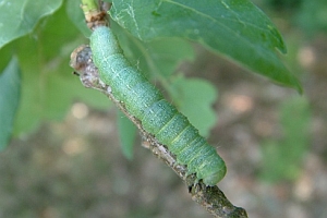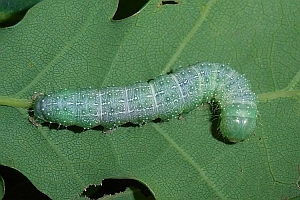 3: Jungraupe, Deutschland, Sachsen, Dübener Heide, Umgebung von Doberschütz, an Stieleiche (Quercus robur), 10. Mai 2008 (leg., cult., det. & manipuliertes Freilandfoto: Heidrun Melzer)