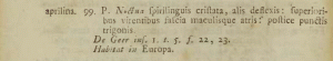 - Erstbeschreibung: Linnaeus, C. (1758): Systema naturae per regna tria naturae, secundum classes, ordines, genera, species, cum characteribus, differentiis, synonymis, locis. Tomus I. Editio decima, reformata. 1-824. Holmiae (Laurentius Salvius).