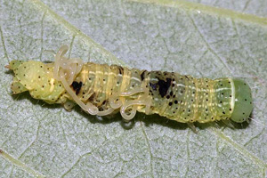 1: Jungraupe mit Kokon einer Microplitis-Art (det. Gergely Várkonyi): Deutschland, Sachsen, Chemnitz, Hutholz, 350 m, 28. Mai 2012 (Foto: Marion Friedrich), det. Raupe Stefan RateringForum