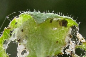4-5: Fraßbild von sehr junger Raupe, an Blattunterseite, Deutschland, Niedersachsen, Umgebung Rodenberg, 130 m, von Hecke gesäumter Feldweg nahe Waldrand, an Prunus spinosa (Schlehe), 9. Mai 2017 (det. durch Zucht & Freilandfotos: Tina Schulz)