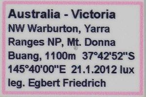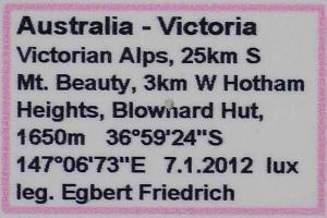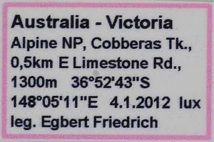 1: ♂, Australia, Victoria, NE Melbourne, Yarra Ranges NP, Mt. Donna Buang, 1100 m, 21. January 2012 lux; (det. & phot.: Egbert Friedrich)