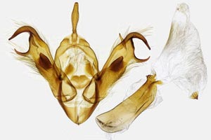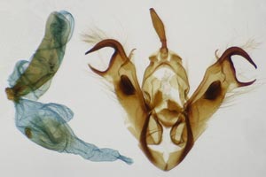 1: Genitalpräparate eines im Forumsbeitrag angefragten ♂, Österreich, Steiermark, Graz, Mariatrost, naturbelassene, wärmebegünstigte, trockene Steinbruchumgebung, am Licht, 1. August 2017 (det., präp. & Foto: Horst Pichler), conf. Wilfried SchäferForum
