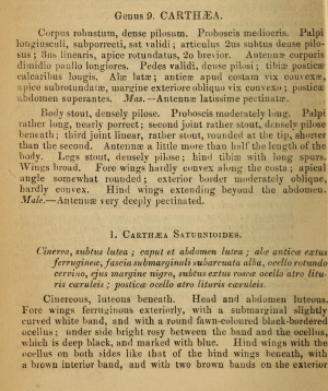 Carthaea saturnoides wurde von Walker (1858) beschrieben und in die Familie "Ommatophoridae", heute Teil der Erebidae (Noctuoidea), gestellt. Später kam es zur Zuordnung zu den Saturniidae, bald aber zur Zuordnung in die Unterfamilie Oenochromatinae der Geometridae.