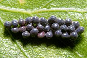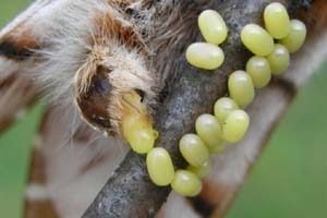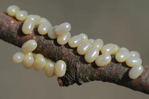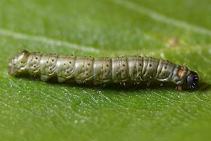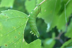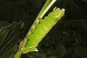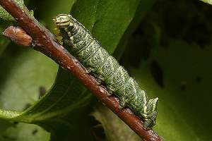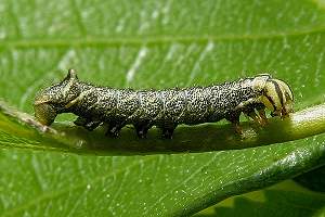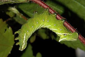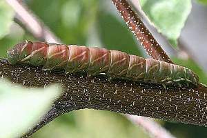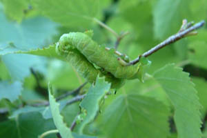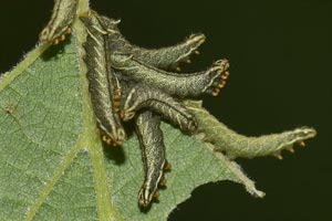 Bergmann (1953: 275) bringt auch noch die Birne (Pyrus sp., Rosaceae) ins Spiel: "Die Raupe lebt zuerst gesellig, später einzeln an Birke, Erle (525), Hasel, Linde und Hainbuche (185). VÖLKER fand sie einmal an Birne (436)." Aber hat die Raupe dort auch gefressen ?