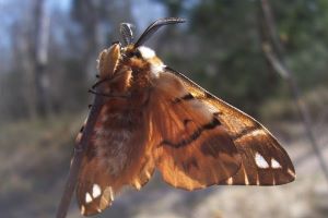 Wenn man das Flugbild kennt, sind die Männchen (tagsüber) gar nicht so schwer zu finden: Sie fliegen recht schnell durch Birkenbestände und erinnern durch Größe und Orangeton im Flug ein bisschen an Aglia tau (der aber später fliegt). Während man sie mit dem Fernglas verfolgt, lassen sie sich manchmal unvermittelt fallen - an diesen Stellen lohnt sich dann die Nachsuche nach lockenden Weibchen am Boden. Trotz des auffallenden Musters sind diese aber gut getarnt [Johannes Kamp im Forum].