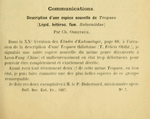 - Erstbeschreibung: Oberthür, C. (1897): Description d'une espèce nouvelle de Tropaea [Lépid. hétéroc. fam. Saturniidae). — Bulletin de la Société entomologique de France 1897: 129-131.