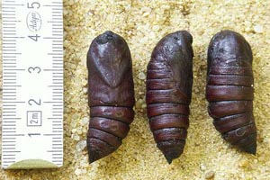 2: Frankreich, Côte d´Azur, Var, Flassans, 300 m, Zucht vom 8. Juni 2006 bis 27. Juli 2006, drei ♂♂ Puppen, Foto vom 13. April 2006 (det., cult. & Studiofoto: Rudolf Haller)Forum