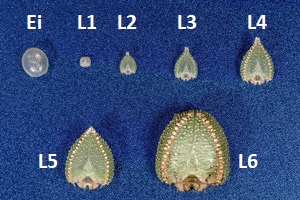 11: Eihülle und Kopfkapseln von L1 bis L6: Rumänien, Donaudelta, Nachzucht, 23. Oktober 2021 (cult. & fot.: Martin Albrecht)Forum
