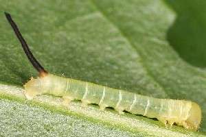 1: Deutschland, Baden-Württemberg, 75203 Königsbach, Raupe an Kartoffelfkraut, 190 m, 12. November 1961, (Treibzucht) (cult., det. & Foto: Hans-Peter Deuring)