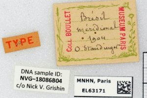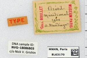 16-18: Paralectotypus ♂, Daten siehe Etiketten (fot.: Nick V. Grishin, Fotos bearbeitet: Michel Kettner), coll. Muséum national d'histoire naturelle. Paris.