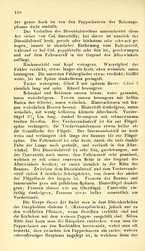 Hofmann (1869: 110-111) berichtet inseiner Erstbeschreibung: "Die Raupe dieser Art findet man in den Blütenkörbchen des Gnaphalium dioicumL. (Katzenpfötchen), jedoch nur an den weiblichen Pflanzen, wenn dieselben verblüht sind und die Körbchen mit dem weissen Pappus ausgefüllt sind. Schon Mitte Juni kann man die Räupchen entdecken, wenn man die Pappushaare aus den Korbhüllen herauszieht, wobei man oft bemerkt, dass zwischen den Pappushaaren ein zartes, weisses röhrenförmiges Gespinnst angelegt ist, in welchem dann das Räupchen steckt. Dieses lebt, wie alle Samenfresser unter den Coleophoren, in der Jugend ohne Sack im Innern der Korbhülle und verzehrt die Samen; erst wenn es seine volle Grösse erreicht hat, was in der zweiten Junihälfte meist der fall ist, verfertigt es sich einen sack aus Gespinnst [...] Wenn der Sack völlig ausgebildet ist, verlässt die Raupe das Blütenkörbchen, läuft eine Zeit lang unruhig umher und sucht sich einen sicheren Versteck am Boden oder Baumstämmen, um ihren Sack da zu befestigen. Das geschieht schon Ende Juni und von dieser Zeit an bleibt die Raupe ruhig sitzen, nimmt keine Nahrung mehr zu sich und überwintert in diesem Zustande [...]".