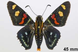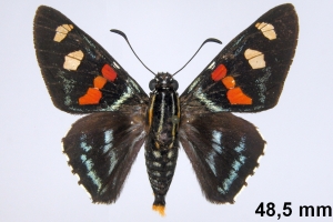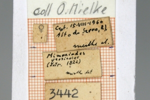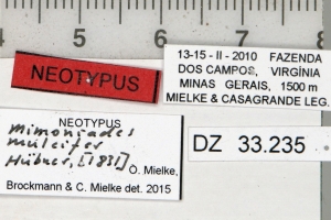 1-3: Neotypus ♂ von Mimoniades mulcifer, Daten siehe Etiketten (fot.: Carlos Mielke, Fotos bearbeitet: Michel Kettner), coll. Departamento de Zoologia, Universidade Federal do Paraná, Curitiba, Paraná, Brazil.