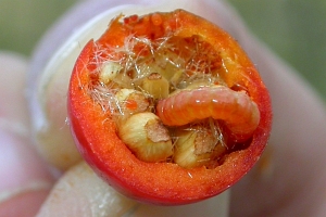 Die Raupe lebt im Herbst in den Früchten (Hagebutten) von Rosen, wo sie sich durch an Fäden hängenden Fraßmehlauswurf verrät. Die Datenbank "Hosts" nennt neben Rosa canina auch Rosa rubiginosa und deren Synonym Rosa eglanteria - Primärquellen dazu sind mir nicht bekannt.