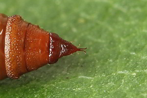 • 8. Sternit (Ventralplatte) mit Randleisten, die erst im hinteren Drittel stärker zusammenneigen und am Ende zu kleinen vorstehenden Wulsten verdickt sind (1).