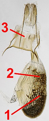 • Aedeagus neben den uncharakteristischen Cornuti (ein basaler rundlicher und den 3 - 4 keulenförmige schuppige) mit einem sehr charakteristischen Cornutus: eine zu einem langen geraden Rohr gerollte Platte (2)