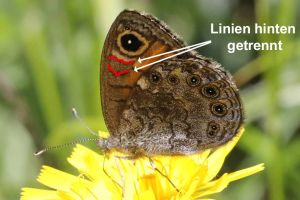 Die erste der dunklen Querlinien in der Vorderflügel-Zelle verläuft bei L. maera auf der dem Kostalrand entfernten Seite auf die in Richtung zum großen Augenfleck hin angrenzende dunkle Linie zu. Bei den beiden anderen arten verlaufen die Linien parallel.