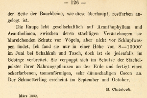 - Erstbeschreibung: Christoph, H. (1882): Zwei neue Schmetterlinge aus Persien. — Horae societatis entomologicae rossicae 17 (1/2): 123-126. St. Pétersbourg (V. Bésobrasoff & Comp.). [Digitalisat auf biodiversitylibrary.org]