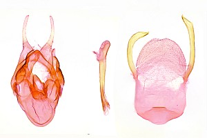 1: Genitalpräparat des als Beleg 3 abgebildeten ♂ (siehe Diagnosebild 3), Ungarn, Villányi-Gebirge, Harkány, 45°51'15.2" N 18°14'02.6" E, e.o. 10. Oktober 1986, leg. ♀ Wingenfeld (gen. präp. und Foto: Harald Lahm)