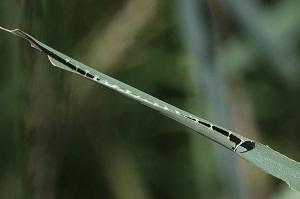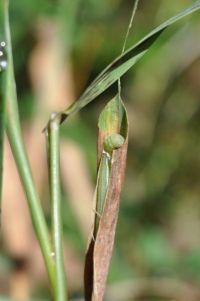 Die beobachteten Eiablagen erfolgten um 17 bzw. 15.30 Uhr an zu diesem Zeitpunkt besonnten Stellen an die Oberseite von frischen, noch senkrecht gestellten Grasspreiten von Reitgras und Fuchsschwanz. Ablage an Molinia konnte nicht beobachtet werden, doch hat auch dieses Gras Ende Mai schon so weit ausgetrieben, daß es zur Eiablage geeignet erscheint.